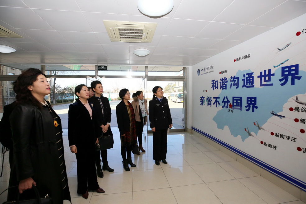 在济南出入境边防检查站,集团女律师一行首先在济南出入境边防检查站领导的陪同下,参观了证件研究室、边检史馆、警用器材室、检查员之家、健身室、图书阅览室等场馆设施,了解了“泉韵边检”文化品牌建设情况,对济南出入境边防检查站担负的职能任务、行政管理、队伍建设、警营文化等情况有了基本了解。济南出入境边防检查站驻守在济南国际机场,主要担负济南至俄罗斯、韩国、日本、新加坡、泰国、越南等20余条国际及国家地区航线的出入境边防检查任务,年查验出入境旅客120万余人次,被誉为“泉城国门卫士”。